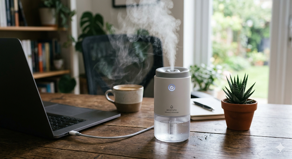 aining air humidity levels essential for health, comfort, and overall well-being. The portable humidifier offers a convenient solution for individuals seeking to improve air quality in various environments, at home, in the office, or during travel. Its compact design allows for easy transportation without sacrificing functionality.